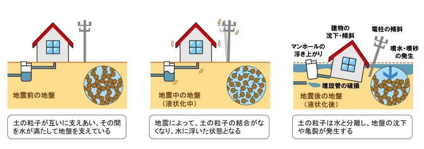液状化は、地震時に地盤が液体状になる現象です。液状化を起こした地盤は、流動したり、土中の水が抜けて沈下することにになり、住宅には致命傷になりかねません。たとえ住宅の杭が硬固な地盤に貫入していて家が沈まなかったとしても、周りの地盤が下がったり、マンホールが浮き上がるなど、生活への影響は甚大です。