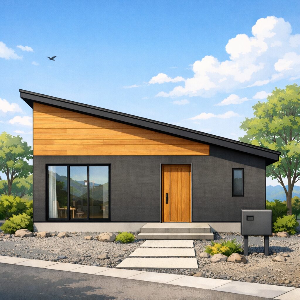 片流れ屋根といって一枚の板に勾配を付けたものも構造はシンプルですが、高いほうの軒が上がってしまうため、屋根と壁の接合部に雨が浸入しやすくなるのが欠点です。